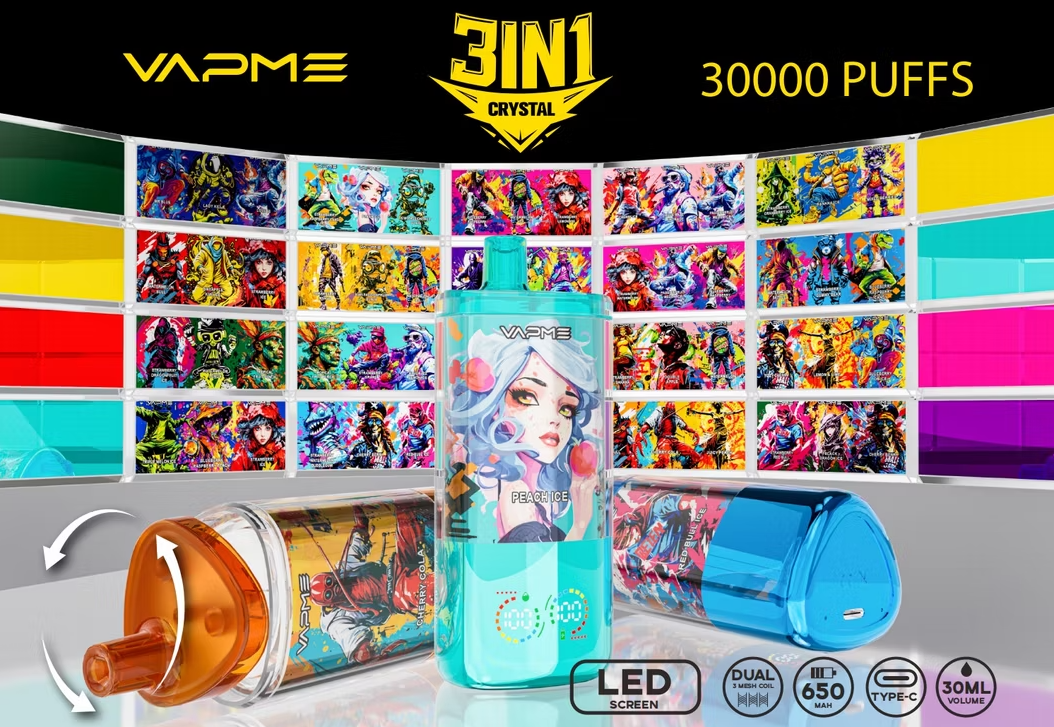Vapme Crystal 30000 Puffs – a premium disposable vape with rechargeable battery, mesh coil technology, and three switchable flavors, ready for EU wholesale and daily use.
